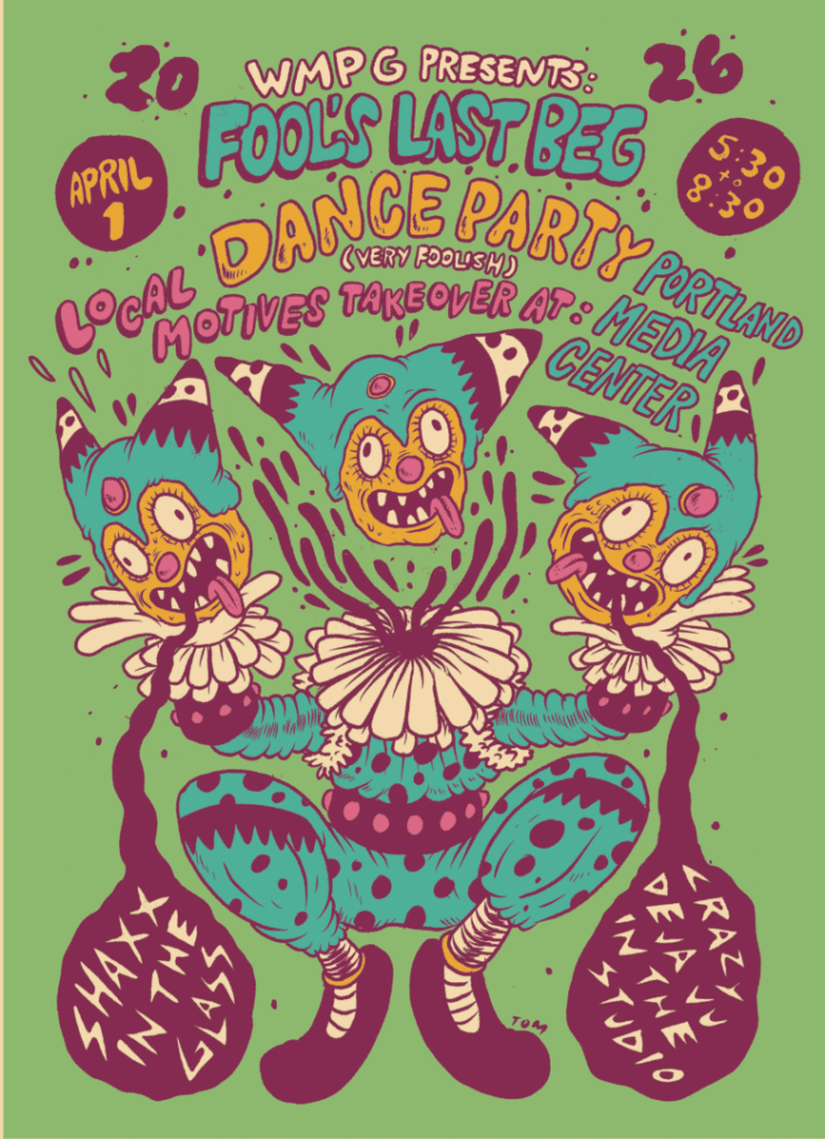 WMPG & Portland Media Center. Right here, we broadcast live to WMPG and to PMC WATCH and to Channel 2, and to our YouTube feed. And what do you ask are we broadcasting live? DJ Bobby Shax is doing Left of the Dial from the behind the glass on Congress Street and then the dance party in the studio. It’s all live, but it’s all happening here at Portland Media Center.